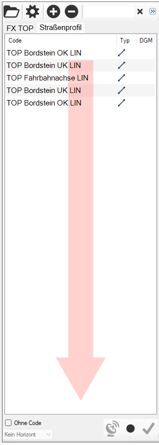 Mit der Autolistenfunktion können z.B. Straßenvermessungen zügiger durchgeführt werden. Hierzu wird eine Codeliste angelegt, die dem Straßenprofil entspricht.