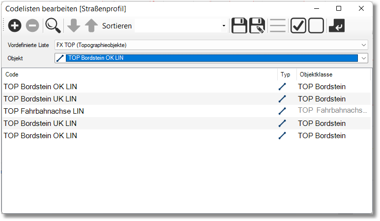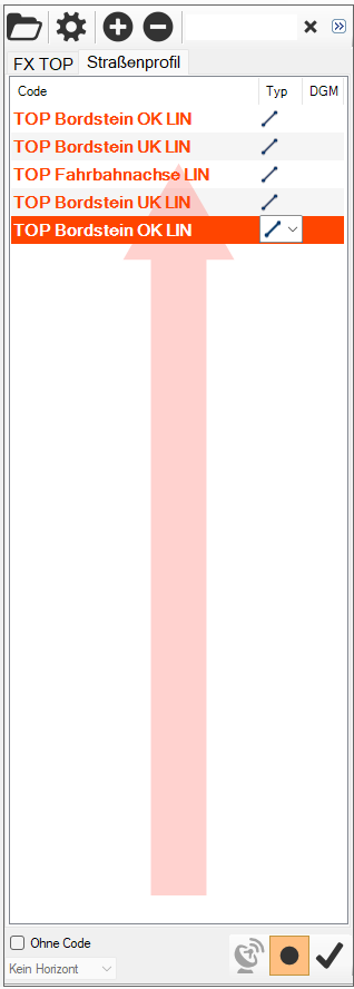 Nach der Erfassung des 1. Codes (TOP Bordstein OK LIN) wird automatisch der 2. Code (TOP Bordstein UK LIN) aktiviert. Dieses Verfahren wird bis zum 5. Code (TOP Bordstein OK LIN) fortgeführt. Ein Klick in die Codeliste auf das zu erfassende Objekt entfällt.