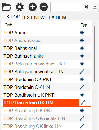 Bei der einfachen Liste werden offene Codes (Linien oder Flächen) in der Liste orange markiert. Das offene Objekt muss erst abgeschlossen werden, bevor eine weitere Linie oder Fläche des gleichen Objekts erfasst werden kann. Ein mehrmaliges Nutzen eines Codes ist nur möglich, wenn in der Codeliste der entsprechende Code mehrfach hinterlegt worden ist.