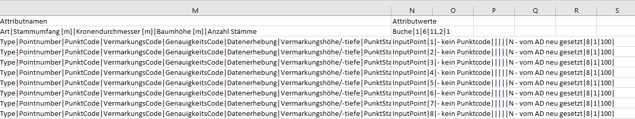 Mit dieser Schnittstelle werden Punktobjekte in eine oder mehrere CSV-Dateien exportiert, die z.B. mit dem Programm Excel geöffnet werden können. Neben der Objektkoordinate werden in weiteren Spalten alle Attribute der Objekte ausgegeben.