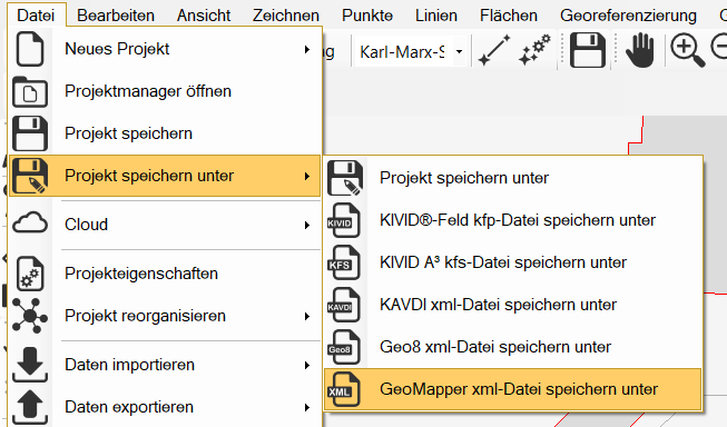 Menü Datei / Projekt speichern unter / Projekt aus GeoMapper xml-Datei speichern