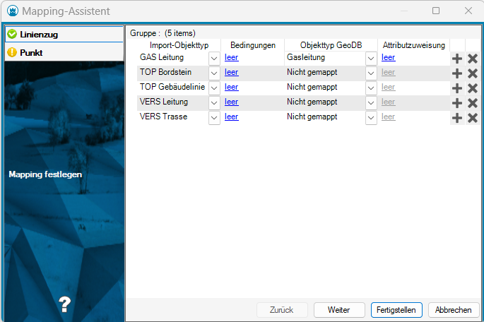 Dort kann zum Beispiel dem FX Objekt GAS Leitung das GeoDB Objekt Gasleitung zugeordnet werden. Die Zuordnung kann gespeichert werden und steht für weitere Importe zur Verfügung. Das Mapping kann für weitere Projekte jederzeit ergänzt werden.