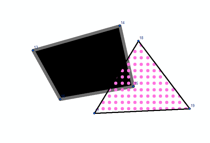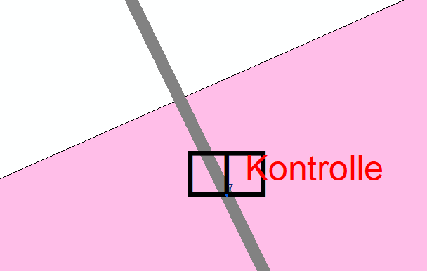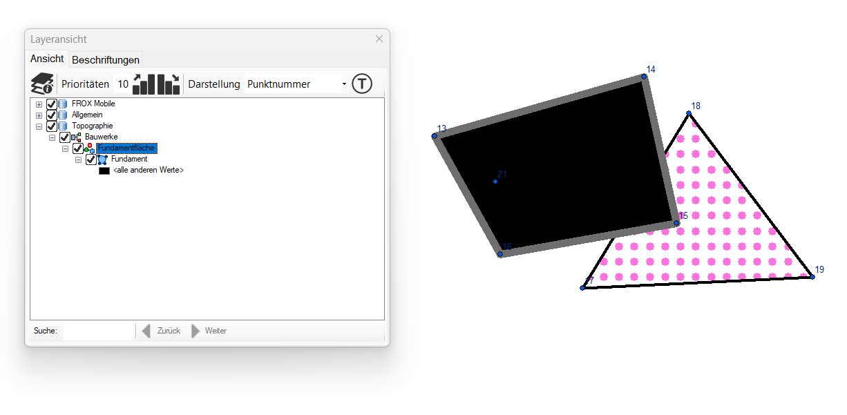 Das Flächenobjekt Fundamentfläche (schwarz) hat im Datenmodell die Priorität 5 und das Flächenobjekt frox User Fläche (pink punktiert) hat die Priorität 10. Die frox User Fläche liegt daher immer über dem Fundament, unabhängig davon, welche Fläche zuerst erstellt wird.