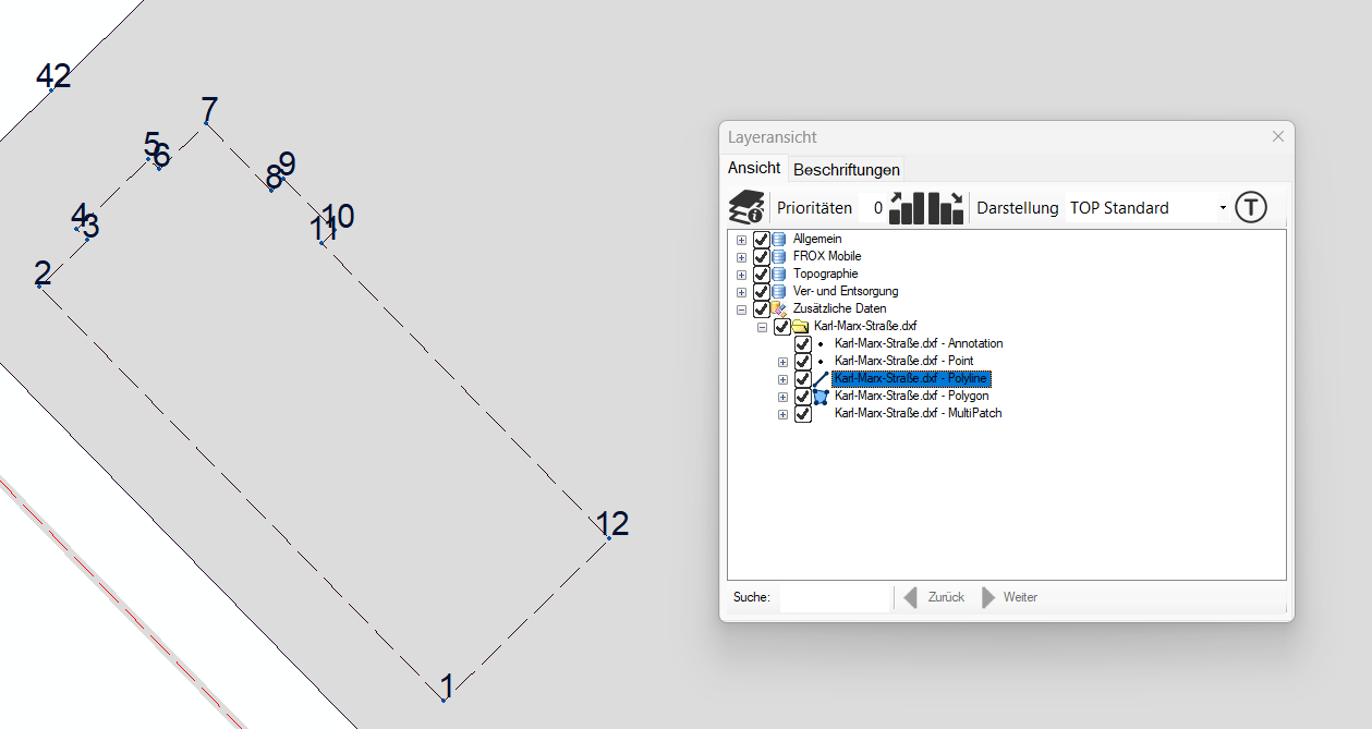 Systemobjekte wie Station, Messpunkt und Konstruktionslinien erhalten immer höchste Priorität und liegen daher über allen anderen Objekten.