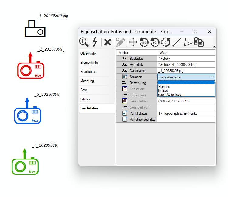 Für den Bereich GIS-Nebenbestimmungen kann im Datenmodell ein Fotoobjekt mit dem Attribut "Situation" erstellt werden. Das Attribut Situation kann mit den Werten Planung, im Bau oder nach Abschluss belegt werden. Es kann auch frei bleiben.