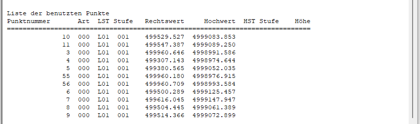 Koordinaten: Es wird eine Liste der benutzen Punkte aus dem KIVID Feld Projekt im Protokoll ausgegeben.