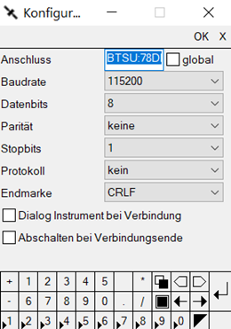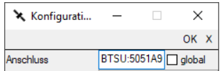 Im Konfigurationsfenster fügen Sie die gespeicherte Geräteadresse in das Feld "Anschluss" über Strg V ein. Wenn Ihre Antenne zuvor gekoppelt wurde, so beginnt die Bluetooth Adresse unter Anschluss mit BTS. Wurde die Antenne ungekoppelt verbunden, so beginnt die Adresse mit BTSU.