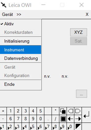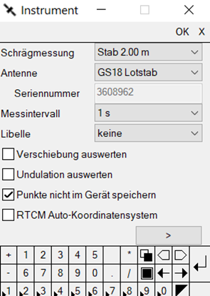 Über das Menü Gerät / Instrument können die Messparameter eingestellt werden (Schrägmessung, Stabhöhe, Messintervall, Trafo, Satellitensysteme, etc.). Das Menü Gerät / Instrument öffnet sich automatisch, wenn im Menü Gerät / Konfiguration bei "Dialog Instrument bei Verbindung" ein Haken gesetzt wird.