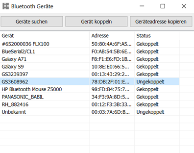 Wenn sich das Fenster öffnet, wird automatisch nach Geräten in der Nähe gesucht. Gekoppelte Geräte werden immer angezeigt. Über den Button "Geräte suchen" kann die Suche manuell gestartet werden.