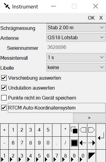 Sollten Sie mit einer Leica Antenne GS 14/15/16/18 T oder 18 I arbeiten und für die Verschiebung oder die Undulation Werte über den Korrekturdatendienst empfangen, dann muss dort ein Haken gesetzt werden ("Verschiebung auswerten" oder/und "Undulation auswerten"). Zusätzlich muss ein Haken bei "RTCM Auto-Koordinatensystem" gesetzt werden. Vorraussetzung für den Empfang dieser Werte ist eine Speicherkarte in der Antenne. Dort werden die Werte zwischengespeichert. Damit dies erfolgt, muss der Haken bei "Punkte nicht im Gerät speichern" entfernt werden.