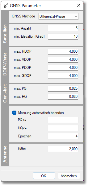 In den GNSS Messprofilen kann bei „GNSS Methode“ eingestellt werden, ab welcher Genauigkeitsstufe erlaubt wird, eine Messung auszulösen.