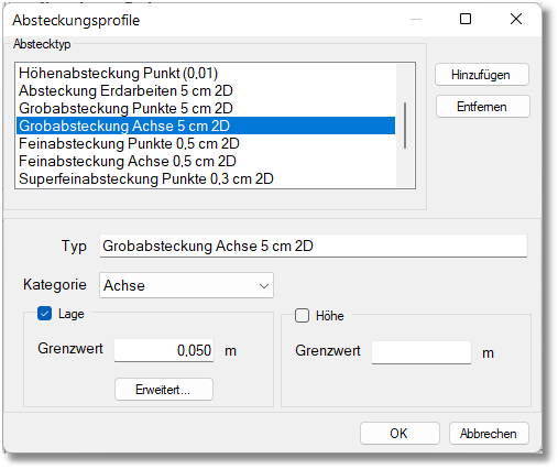 Für die Kategorien Punkt und Achse kann man nun entscheiden, ob man Lage und Höhe, nur Lage oder nur Höhe abstecken möchte, sowie die entsprechenden Genauigkeiten eingeben, die man bei der Anwendung des Profils erreichen möchte.