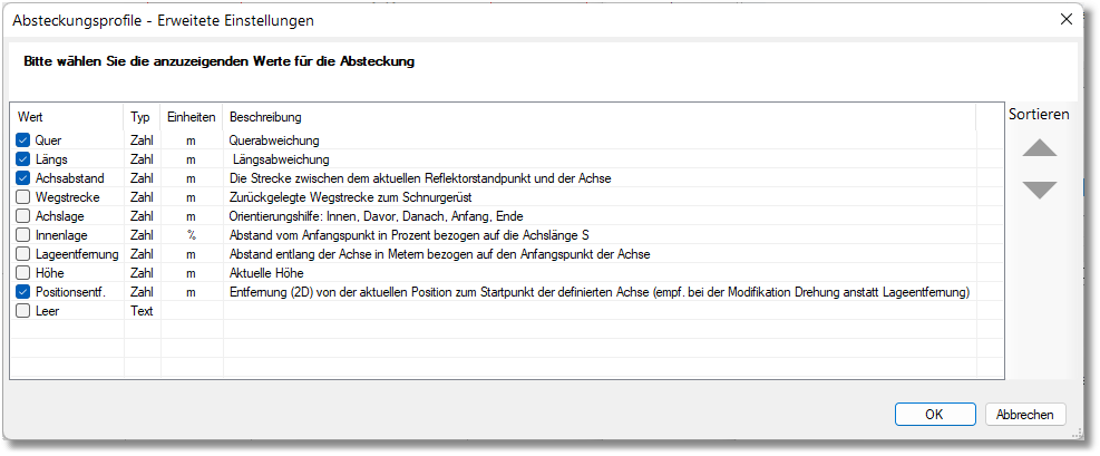 Bei Klick auf den Button <Erweitert> öffnet sich ein neues Fenster, in dem ausgewählt werden kann, welche Werte bei der Absteckung angezeigt werden. Die Liste enthält zusätzlich eine Erläuterung dieser Werte. Es können maximal vier Werte ausgewählt werden.