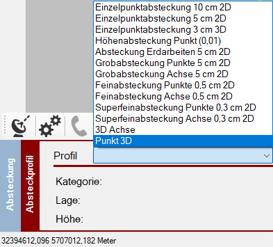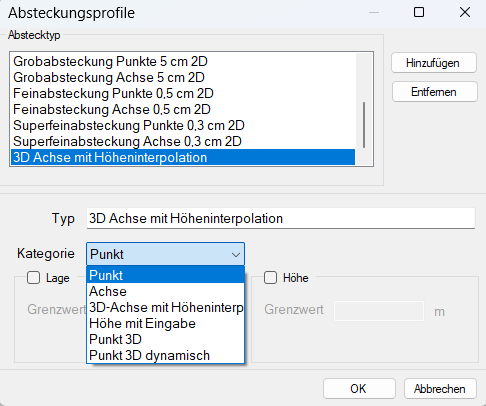 Bei Kategorie stehen Punkt und Achse zur Verfügung. Außerdem Achsabsteckung in 3D mit Höheninterpolation und Punktabsteckung in 3D sowie Punktabsteckung 3D dynamisch. Außerdem die Absteckung der Höhe bei Punkten ohne Lage (Höhe mit Eingabe).
