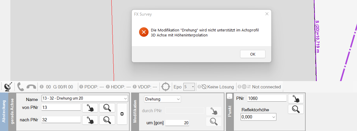 Bei dem Profil 3D Achse mit Höheninterpolation sind keine Modifikationen der Achse möglich. Beim Wechsel in den Messmodus wird dies geprüft und die entsprechende Meldung ausgegeben.