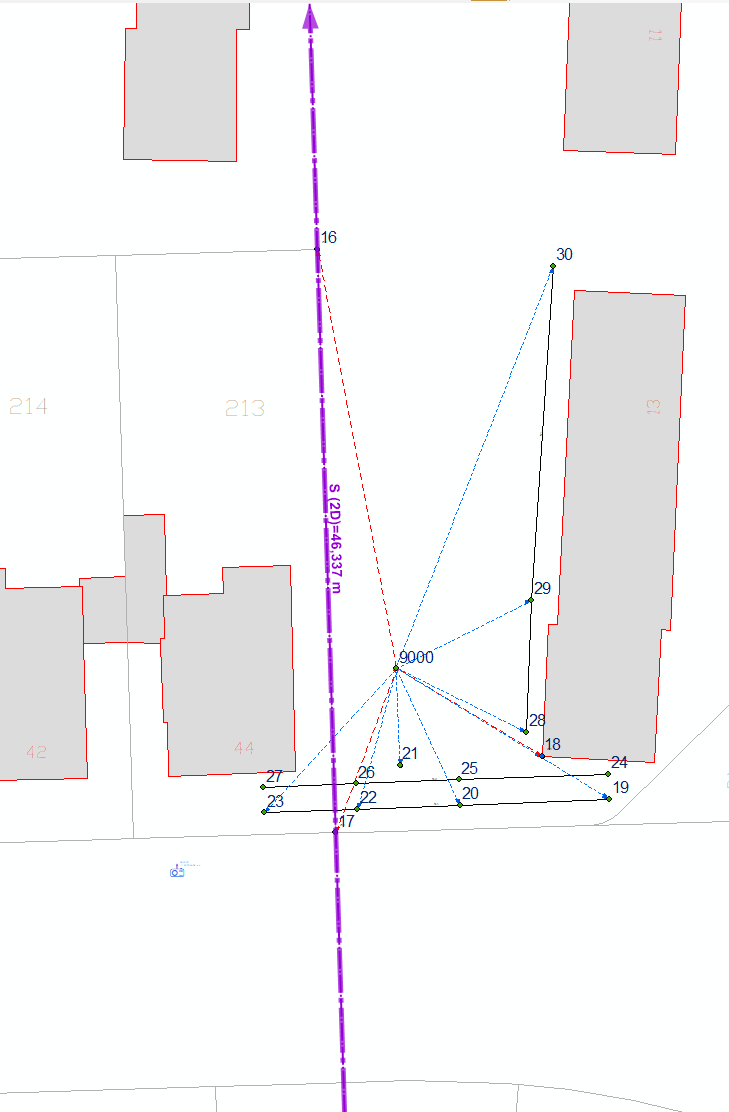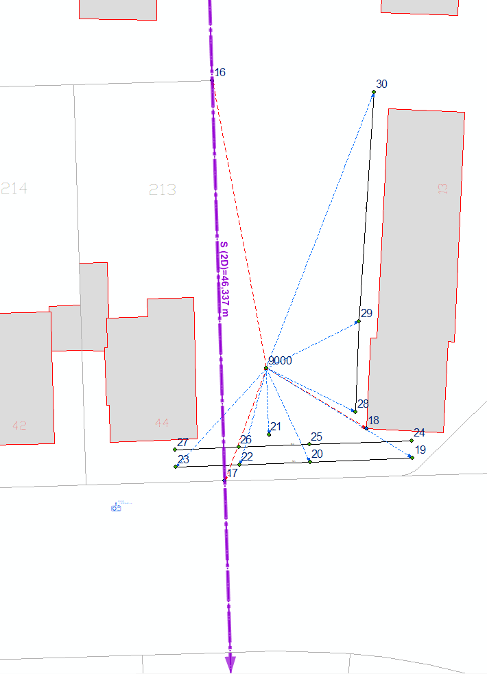 Im Beispiel wurde die Achse von Punkt 16 nach Punkt 17 definiert und zeigt auch in diese Richtung. Als weitere Information wird die horizontale Entfernung zwischen den definierten Punkten angezeigt. Die Achse wird immer über den gesamten Bildschirm gezeichnet, sobald sie innerhalb des Bildschirms liegt.