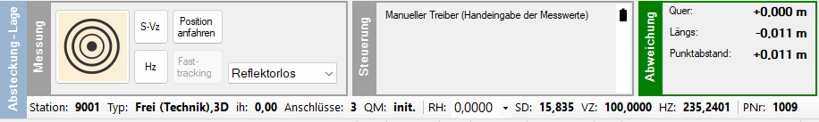 Wie bei der Lageabsteckung gibt es auch hier die Box Abweichung mit gleicher Funktionsweise wie bei der Lageabsteckung. Auch hier ist das Fasttracking möglich. In der Box werden bei Fasttracking laufend und beim Auslösen einer Messung exakt die entsprechenden Werte gelistet. Hierbei bedeuten: