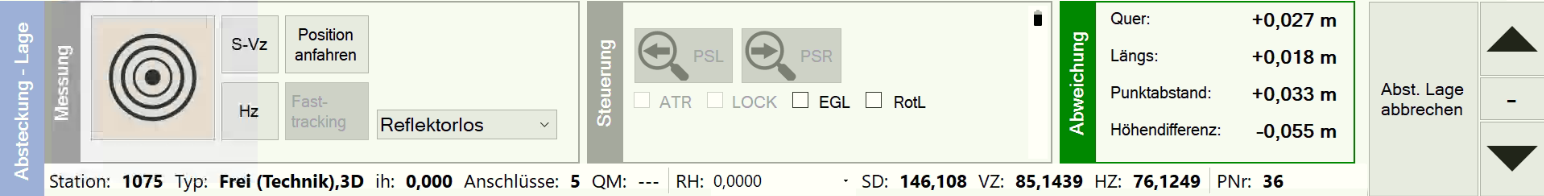 Über den großen Messbutton auf der linken Seite wird die Messung zum Reflektor ausgelöst. Der Abstand zum Sollpunkt und dessen Unterteilung in Längs- und Querrichtung bezogen auf das Tachymeter werden in der Box Abweichung angezeigt. Sobald die Abweichung zum Sollpunkt die im Absteckungsprofil definierte maximale Lageabweichung erreicht oder unterschreitet, wird die Box Abweichung in grün dargestellt. Erst dann ist die Pfeiltaste nach unten auf der rechten Seite zur Weiterführung des Workflows freigeschaltet. Wurden die Grenzwerte noch nicht erreicht (die Box Abweichung ist dann Rot), bewegen Sie sich weiter zum abzusteckenden Punkt und führen ernuet eine Messung aus. Es entsteht dabei noch keine Messungpunkt. Wiederholen Sie dies, bis die Grenzwerte erreicht sind.