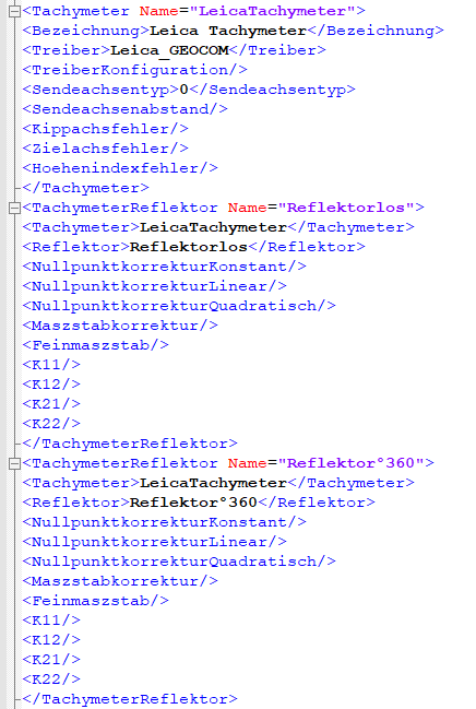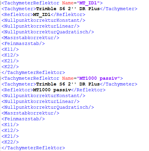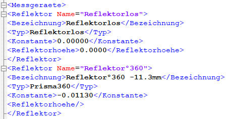 Zunächst werden in der kfp im Knoten Messgeraete die Reflektoren mit Name, Typ und Absolutkonstante eingetragen. Auch für reflektorloses Messen wird ein Reflektor angelegt.